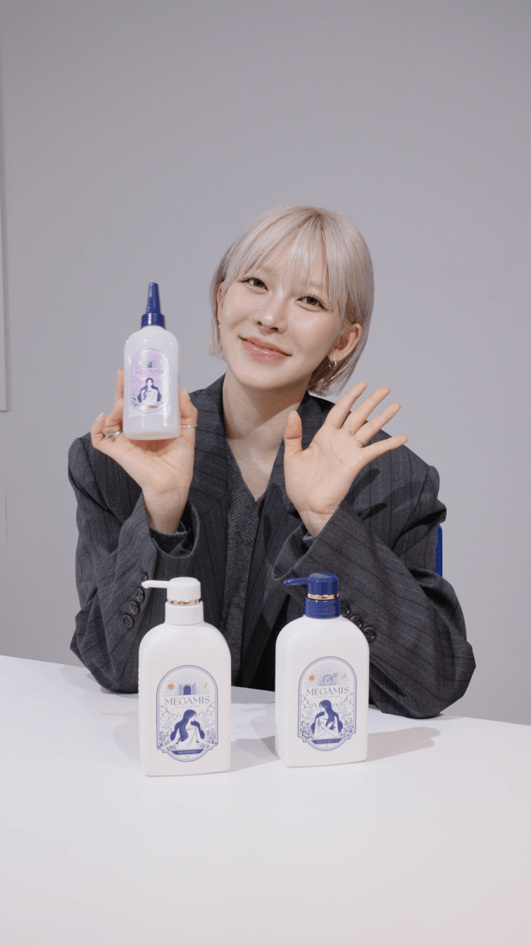 金髪なので、シャンプー・紫シャンプー・セラム・トリートメントなど、いろんな工程を経てケアする必要があるんですけど、『MEGAMIS』はシャンプーした後に、セラムをつけて、トリートメントで閉じ込めるこの3つのステップで完結するのも嬉しいポイントですね。