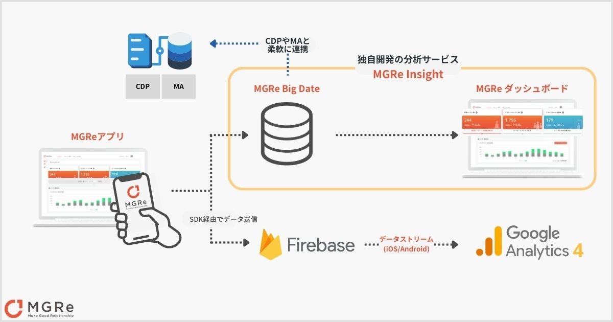 MGReでは、Firebase SDKの組み込みはもちろん、計測イベントの設計・実装に関してもMGRe独自の分析サービス『MGRe insight』の仕組みを応用することで、MGReのGA4対応を標準機能として提供することといたしました。MGReをご利用のお客様は、GA4でMGReのデータを使った分析をすぐに始めることが可能です。