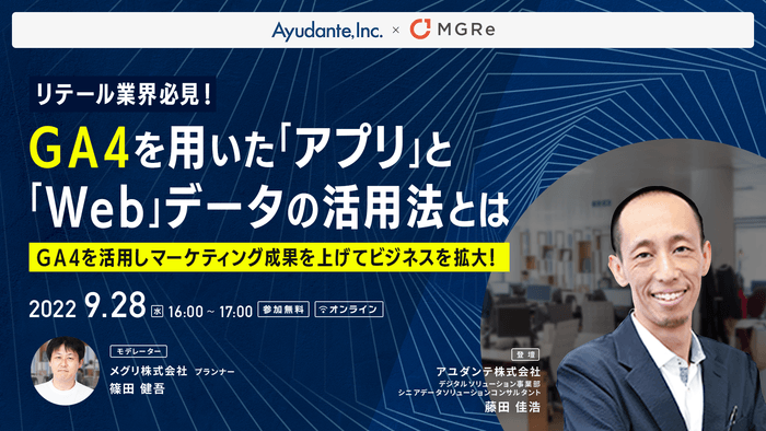 「GA4を用いた「アプリ」と「Web」データの活用法とは」をテーマに、SEOコンサルティングやGoogle アナリティクス導入・設定支援/データ活用支援などを行う、アユダンテ株式会社と対談形式でお届けします。