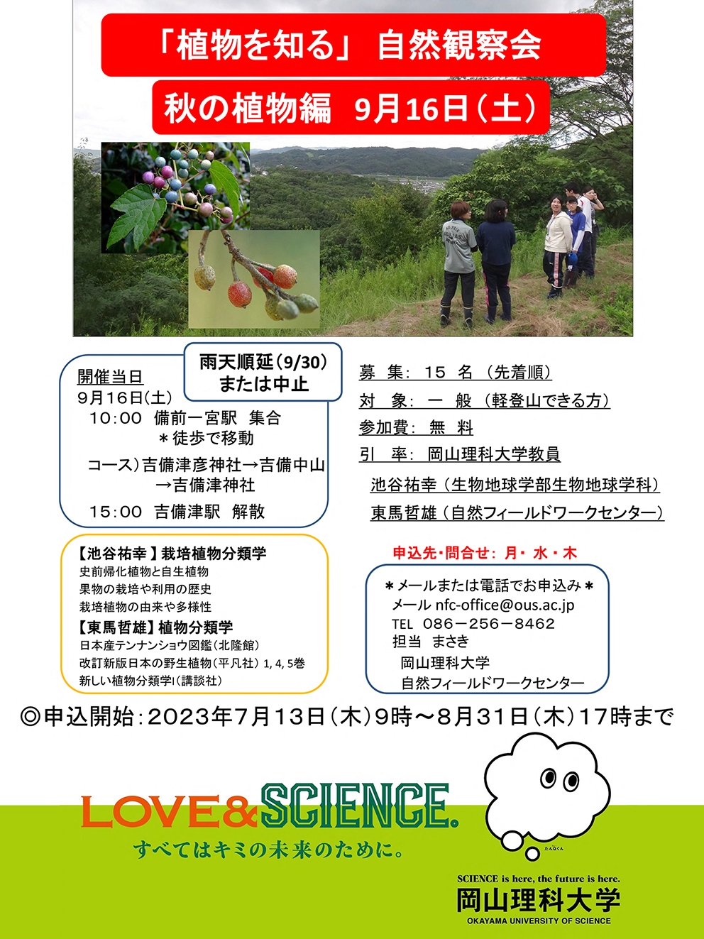 【岡山理科大学 自然フィールドワークセンター】「植物を知る」自然観察会 秋の植物編|日時:2023年9月16日(土)10:00~開催!参加無料 7月13日より申込開始!