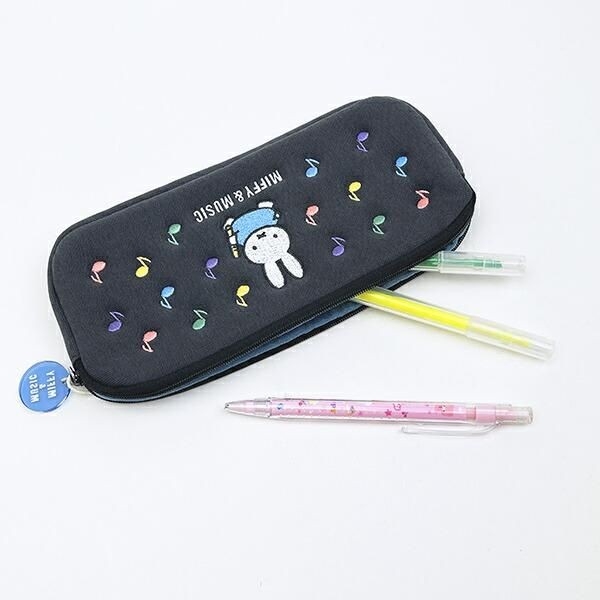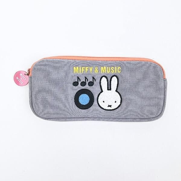 MIFFY&MUSICシリーズのペンケース。たくさんの音符と、笛をもつミッフィーちゃん。今にも音楽が聞こえてきそうなデザインです。