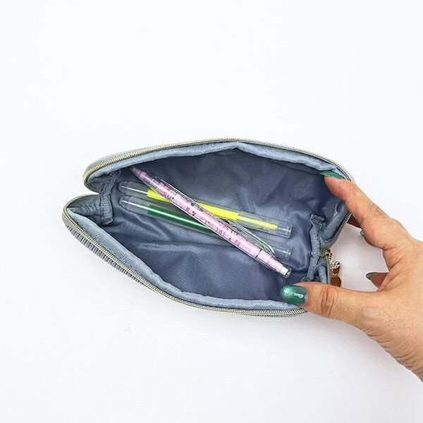 こちらは、グレーのペンケース。グレーは落ち着いた印象でこれはこれでオシャレ!デスクに置いてあると気分が上がって、「頑張ろう!」と思えるかも。