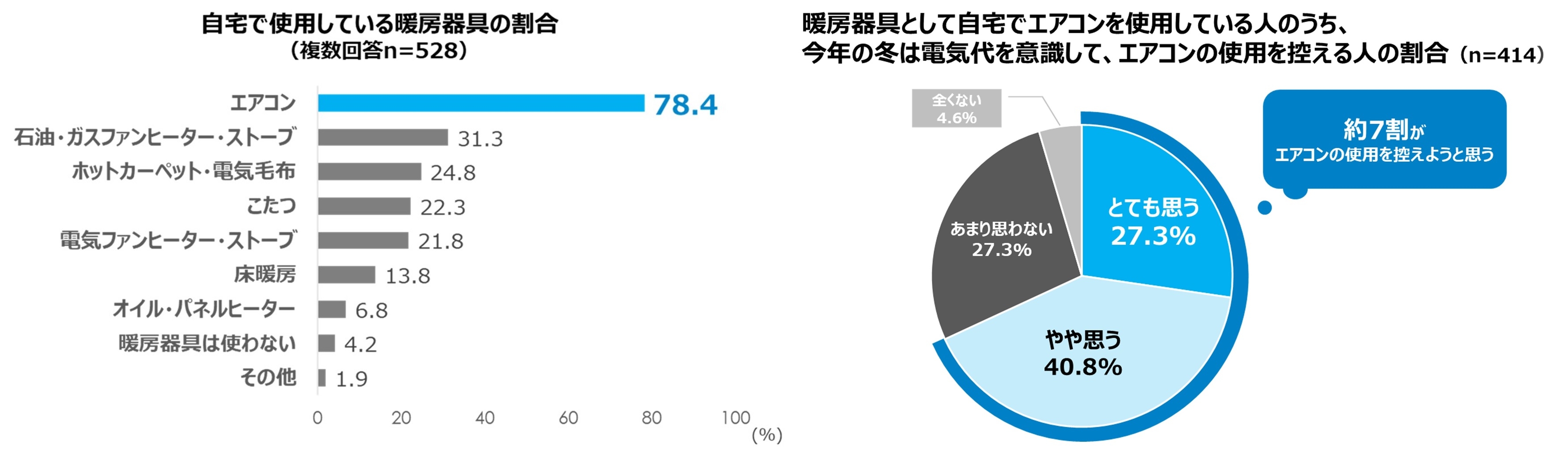 自宅で使われている暖房器具の第1位は「エアコン」(78.4%) エアコン使用者の約7割が電気代を気にしてエアコンの使用控えを検討
