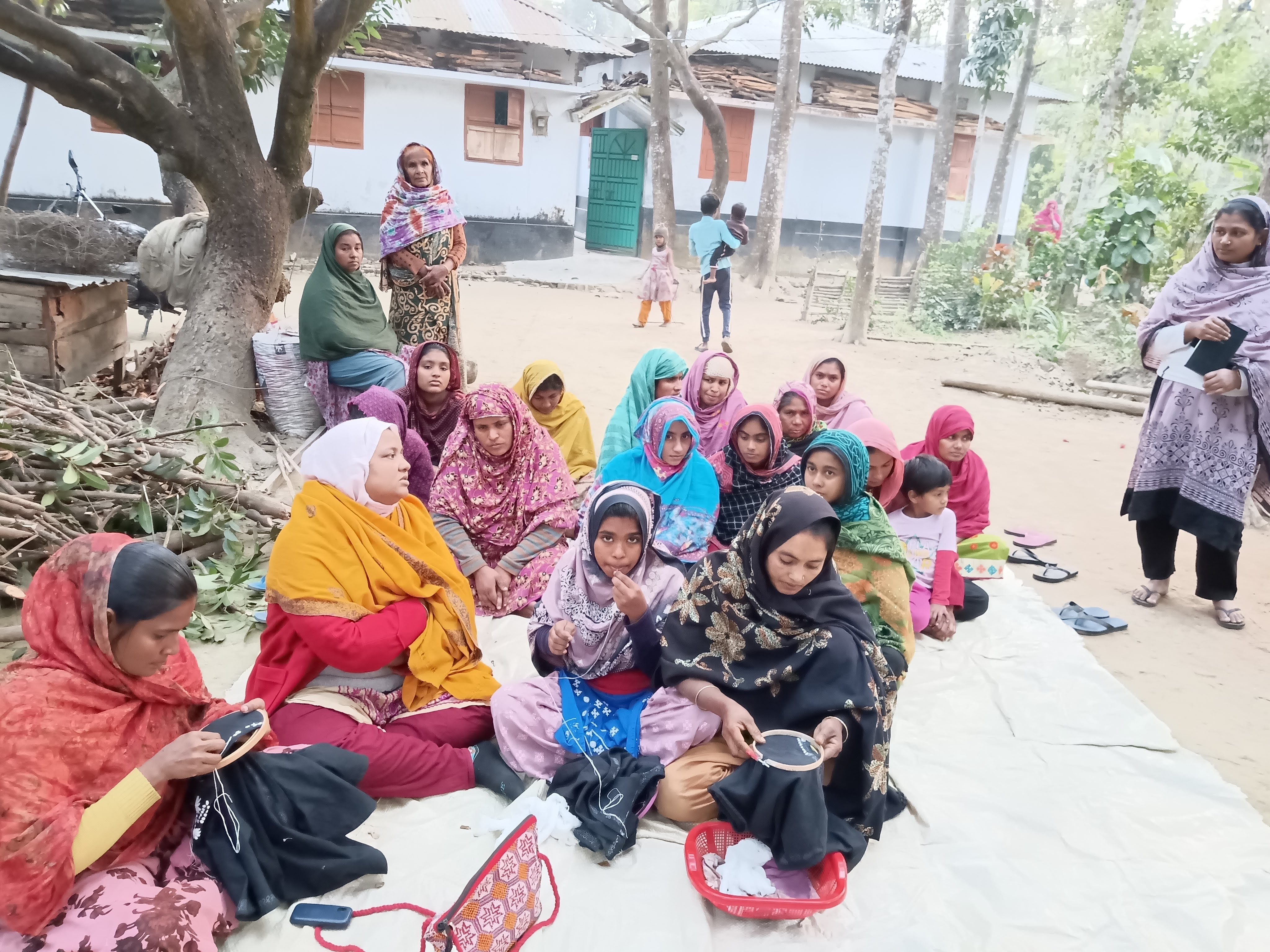 女性中心のプロジェクトのため、通常男性の仕事とされる手織りも女性によって行われています。アゾフリー染料で糸を染色し、手織りや手刺繍、縫製などの手仕事を活かした収入プロジェクトや、貧しい子どものための小学校の運営など、製品づくりと地域開発の両輪で活動を行っています。