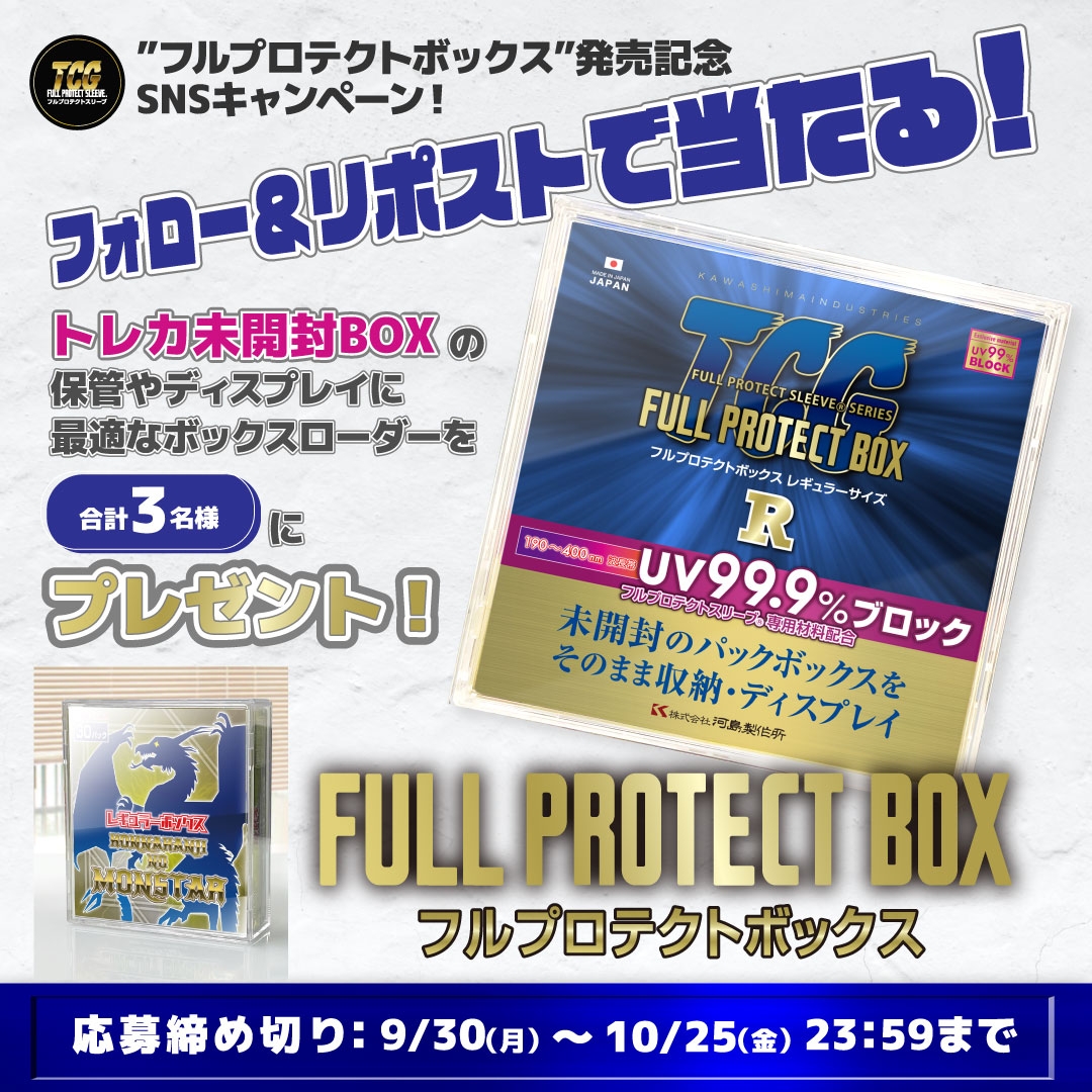 フルプロテクトスリーブ公式Xでは、フルプロテクトボックス発売記念キャンペーンを開催。フルプロテクトスリーブ公式Xをフォロー&リポストで、合計3名様にフルプロテクトボックスR(レギュラーサイズ)をプレゼントいたします。