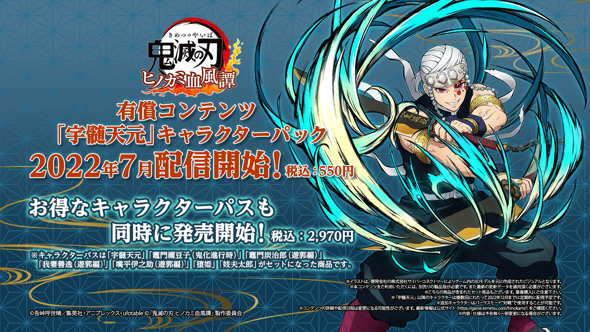 有償コンテンツ「追加キャラクターパック」は、アニメ「鬼滅の刃 遊郭編」に登場するキャラクターが、バーサスモードで使用になるコンテンツで、第1弾を皮切りに「宇髄天元」「竈門禰豆子(鬼化進行時)」「竈門炭治郎(遊郭編)」「我妻善逸(遊郭編)」「嘴平伊之助(遊郭編)」「堕姫」「妓夫太郎」を全5回にわたって配信を行います。