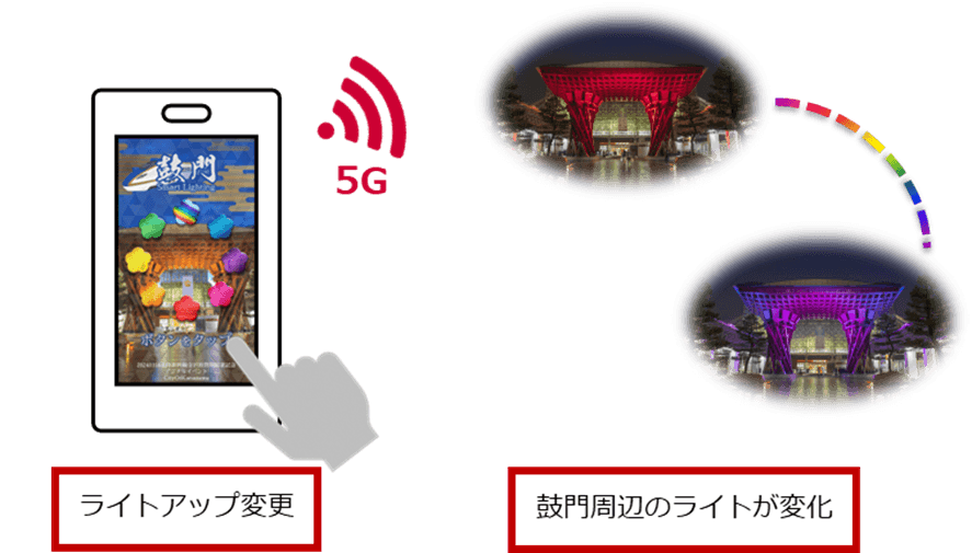 5G通信やIoT技術を用いて、鼓門をインタラクティブにライトアップします。鼓門周辺に用意されるタブレットを用いて8パターンの選択肢から、イベント参加者が自分の好みのライトアップに変更ができ当日だけの特別感のあるライトアップや写真撮影が可能となります。