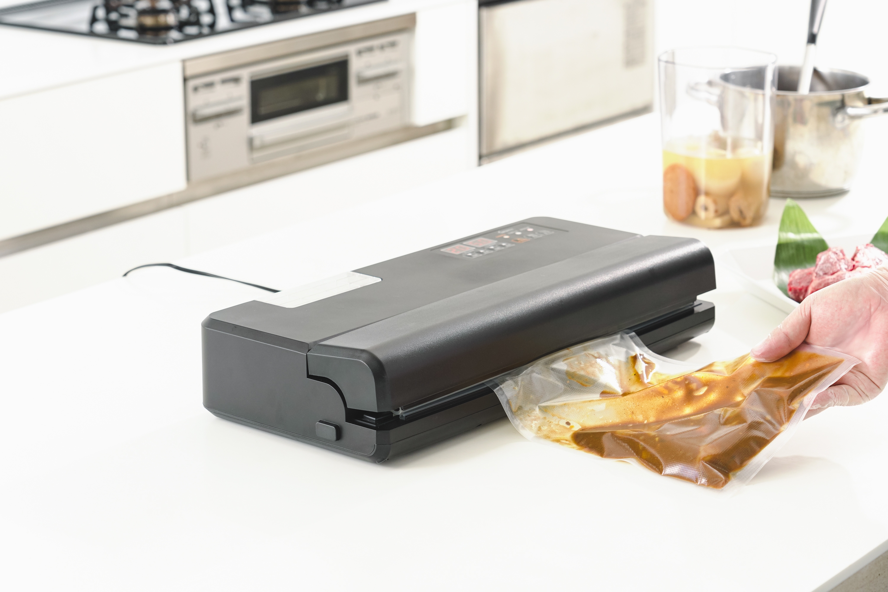 真空パック器とは、袋や容器の中を真空状態にする機器のことで、食材・調理品の保存や鮮度維持、保管スペースの有効活用、食料備蓄など、様々な用途に対応できます。真空パック器を使用すると、食材の酸化が予防されるので保存期間が延長され、食材を無駄なく使いきることができ節約になります。常温保存品など大容量のものを新鮮なまま小分けにしたい場合にも役立ちますし、空気を抜かれた分だけ省スペース化できます。また、作り置きの保存はもちろん、真空パックにして食材をつけこむと通常よりも早く味がしみこむため時短にもつながり、子育て中の方、シングルペアレントの方など、家事に忙しい人の助けになっています。