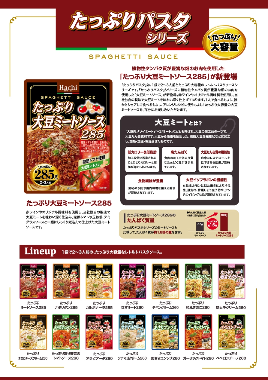 ハチ食品株式会社(大阪府大阪市、代表取締役社長:高橋 慎一)は、当社が展開するたっぷり大容量のレトルトパスタソースシリーズ『たっぷりパスタ』の新商品として、「たっぷり大豆ミートソース285」を2021年8月2日(月)に発売いたします。