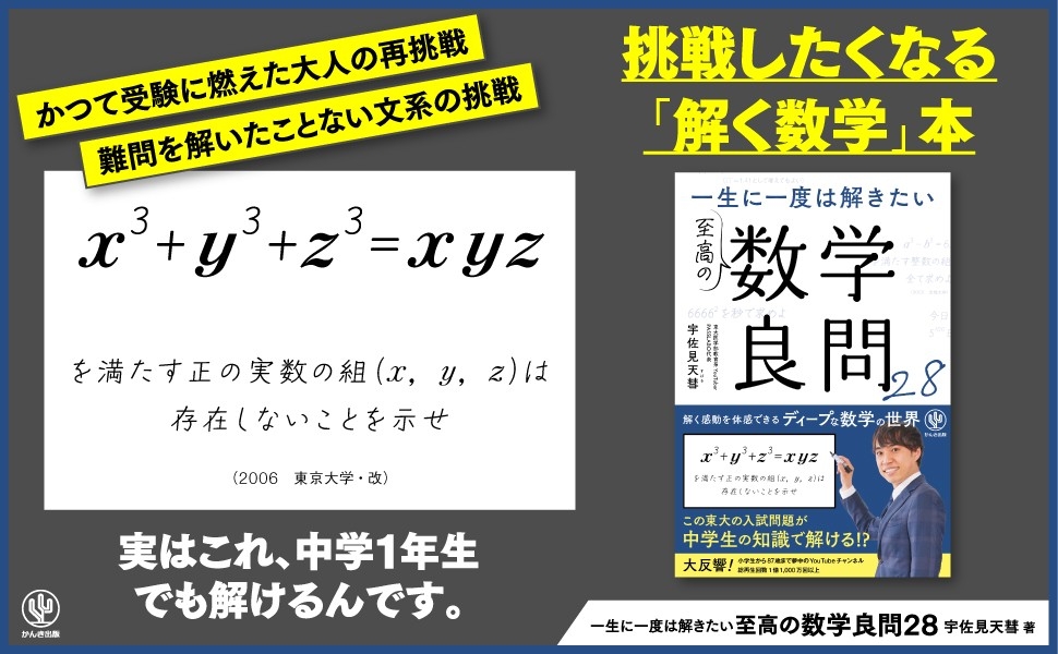 YouTubeチャンネル「PASSLABO」「MathLABO」でおなじみ、宇佐見天彗氏による「挑戦したくなる数学問題」本がついに登場です。