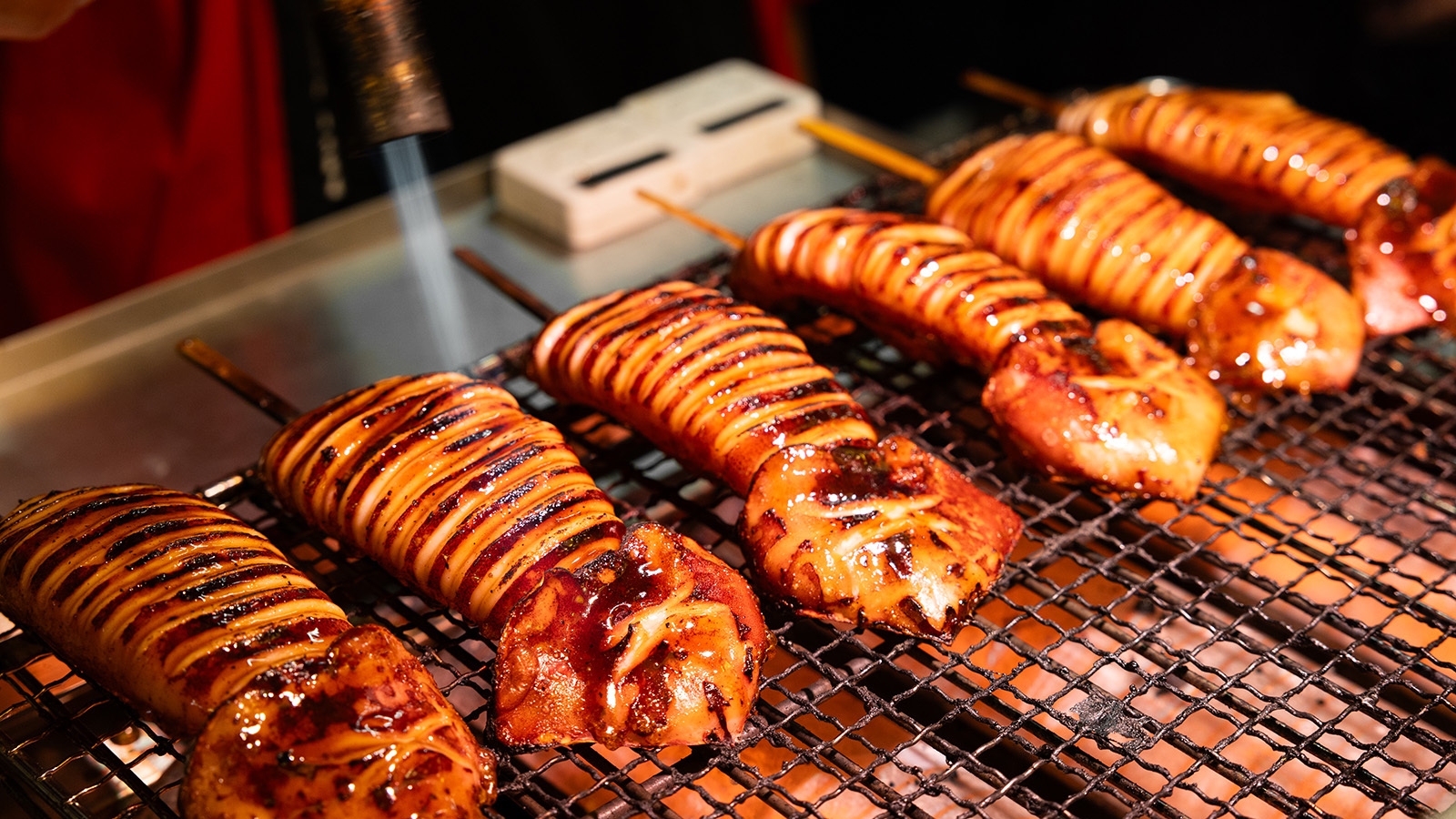 屋台グルメでお馴染みのイカの姿焼き。炭火で丁寧に焼き上げた香ばしい香りとぷりぷりの食感が魅力です。仕上げにバーナーで炙り、甘辛い特製タレをしっかり染み込ませることで、風味豊かで満足感たっぷりの絶品メニューに仕上げました!