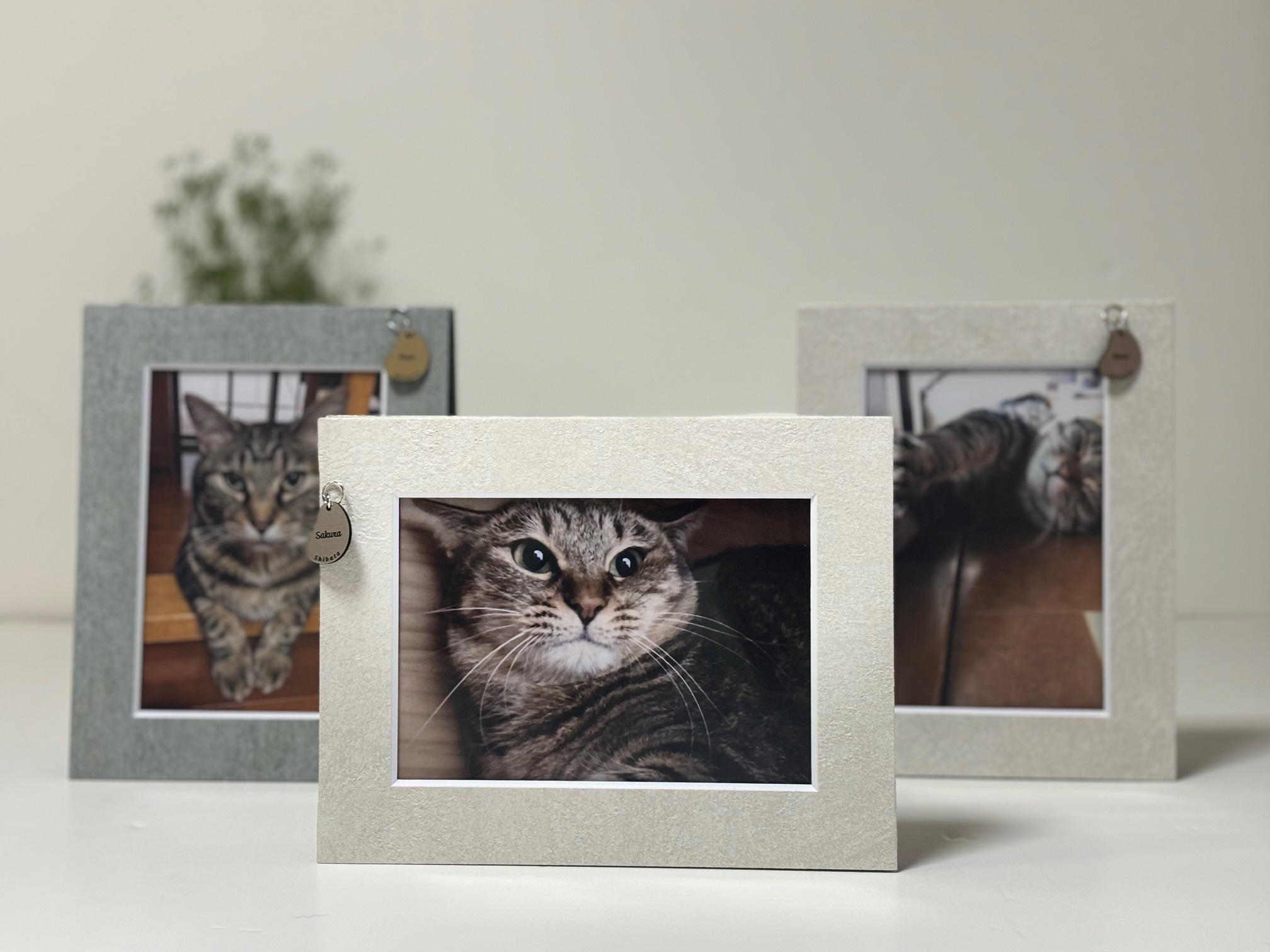 この商品は、お客様からデータを預かりし、写真館でも使われている、最高級仕様純正印画紙で印刷し台紙に納めさせていただきます。気分やシーンに合わせて写真を入れ替えられるだけでなく、わんちゃん、ねこちゃんの名前を刻んだオーダーメイドのネームタグ付きで、特別な思い出としてお楽しみいただけます。