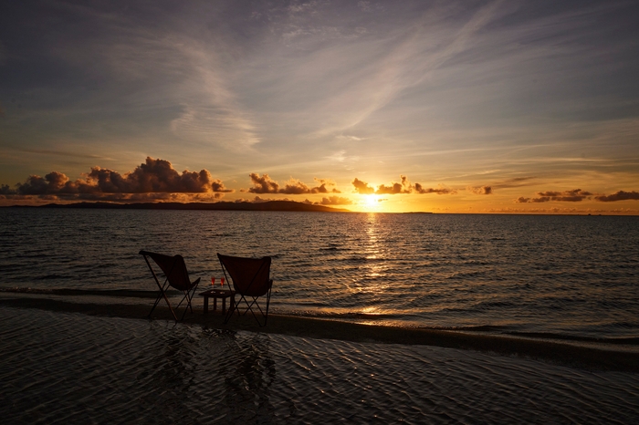 夕焼けが最も色濃く美しく見える時間にサンドバーに上陸します。夕日が地平線に沈む頃、サンドバーに席を設け、寛ぎながら夕焼け色のカクテルで乾杯します。パッションフルーツのジュースに、ザクロシロップとスパークリングワインを合わせた甘酸っぱい味わいです。夕焼けの様子も、そこに出来る砂浜の形も、二度と同じものは見られません。そこで過ごしたふたりの時間は忘れられない思い出になります。