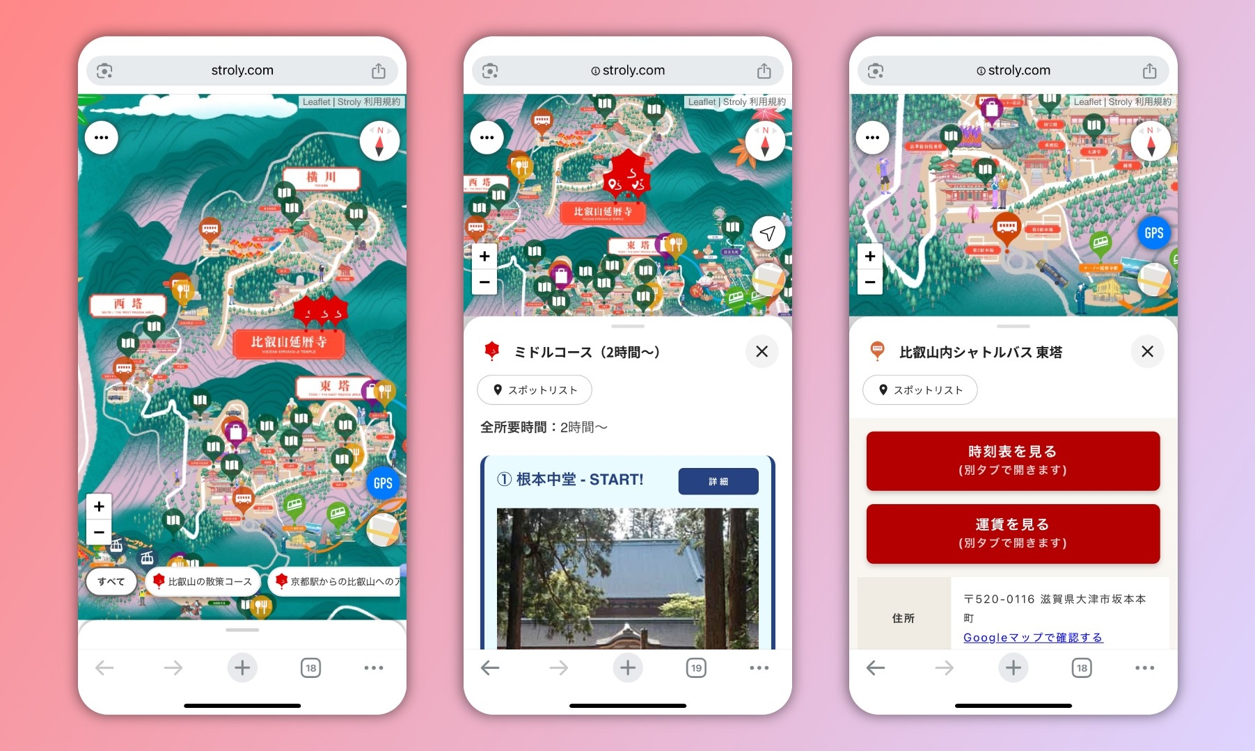 「比叡山・びわ湖 観光MAP」は、従来の観光ガイドマップにない以下の機能と利便性を提供します。