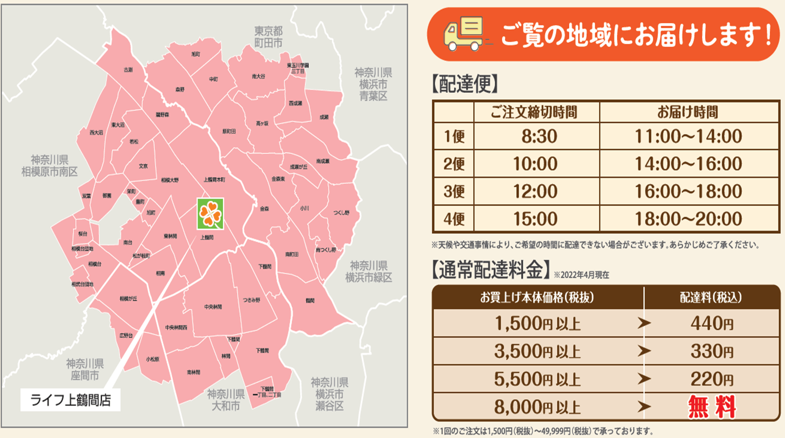 “おいしい” “ワクワク” “ハッピー” をお届けするライフコーポレーションは、11月6日(水)から「上鶴間店」でライフネットスーパーのサービスを開始しました。