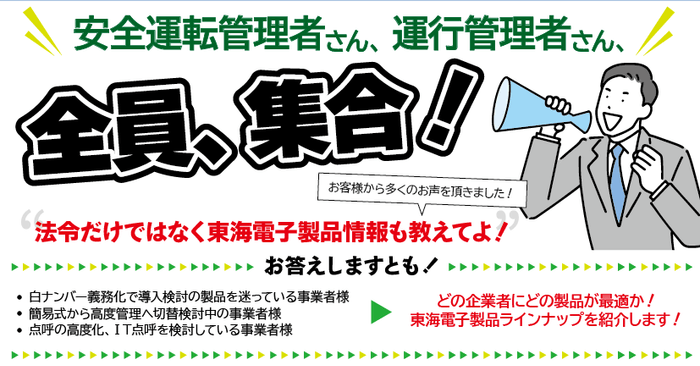 今春からスタートする白ナンバーの飲酒検査義務化。しかし未だ導入製品を決めかねている事業者様も多いのではないでしょうか。そんなお困りの安全運転管理者さん、運行管理者さん、全員集合です!