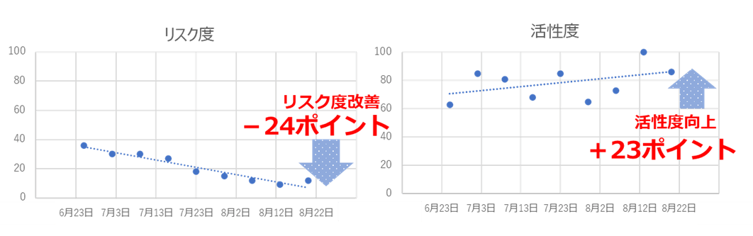 NTTPCで実証実験を行ったところ、最大でストレス状態などのリスク度(※1)が24ポイント改善、仕事のやる気などの活性度(※2)が23ポイント向上いたしました。
