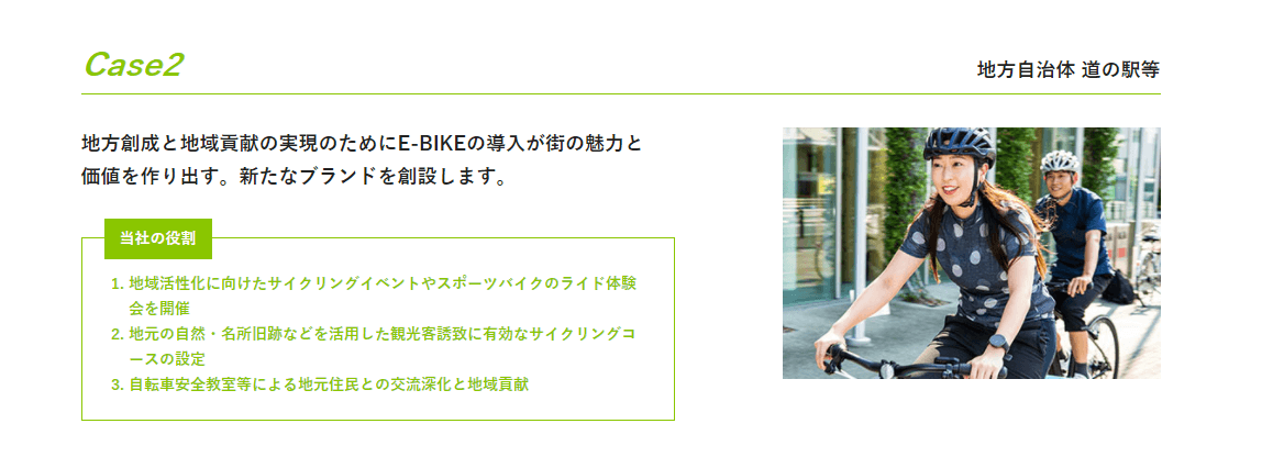 E-BIKEを活用した新しいサイクリングライフのご提案に加え、特設ページにて観光業界や地方自治体、一般企業様などへの導入提案や事例などを紹介していきます。
