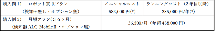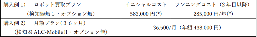 購入方法(価格)は、ロボット本体を購入・所有し、年間のランニングコストを支払う方法、及び月額契約により初期導入コストを抑え、毎月定額で払い続ける方法、大きく2つあります。