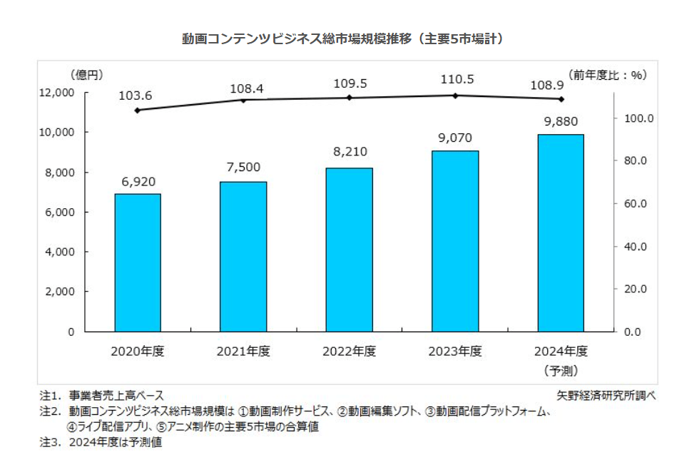 2024年度の動画コンテンツビジネス総市場規模(主要5市場計)は前年度比108.9%の9,880億円を予測