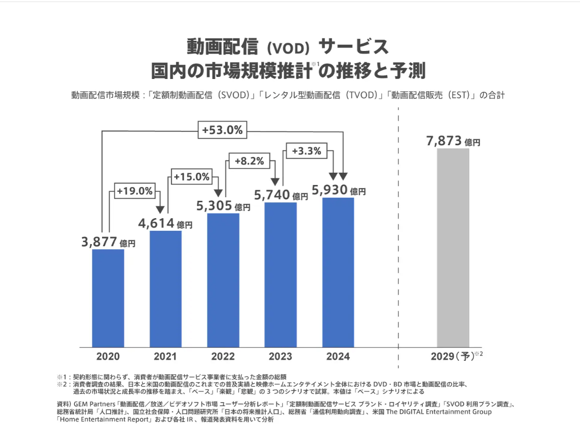2024年の動画配信(VOD)サービス全体(「定額制動画配信(SVOD)」「レンタル型動画配信(TVOD)」「動画配信販売(EST)」の合計)の国内市場規模は、前年比3.3%増の5,930億円と推計されました。この値は1年間の間に消費者がこれらの動画配信サービス事業者に支払った金額を推計したもので、広告収入等は含まれません。コロナ禍に入った2020年と比較すると市場規模は53.0%増加し、約1.5倍の規模に成長しています。