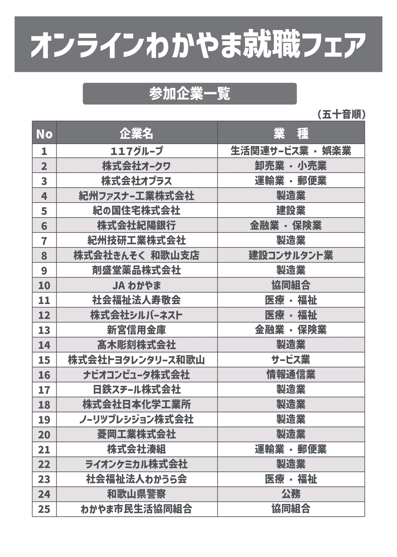 和歌山県内のさまざまな業界から、製造業、医療福祉、建設、金融、小売、IT、公務まで、多彩な25社が一堂に会します。