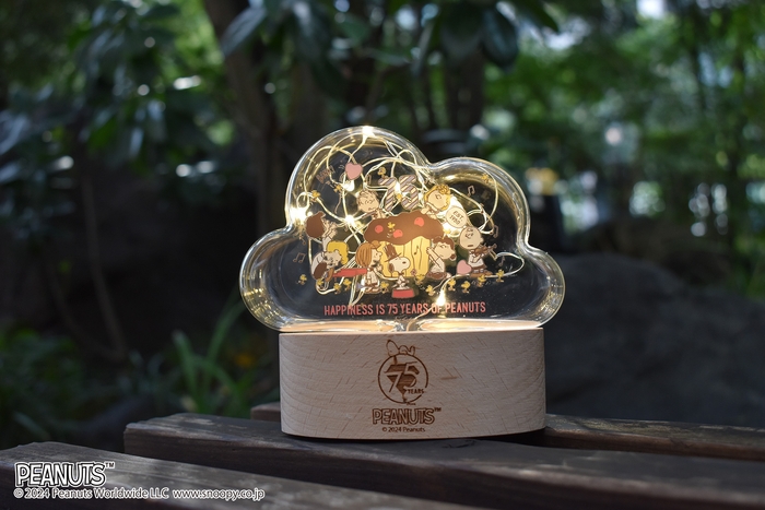 PEANUTS75周年を記念した限定デザインのスヌーピーLEDライトが新発売。ガラスの中で光るLEDライトのコードがまるで部屋を彩る電飾のように、アニバーサリーをお祝いするPEANUTSキャラクターたちを優しく照らします。ガラスシェードは人気のクラウド形で、天然木の台座には焼き印風のレーザー刻印をほどこし、上質な雰囲気も合わせ持つインテリアアイテムに仕上げました。PEANUTSファンはもちろん、誕生日や記念日などお祝いのプレゼントにもお勧めです。