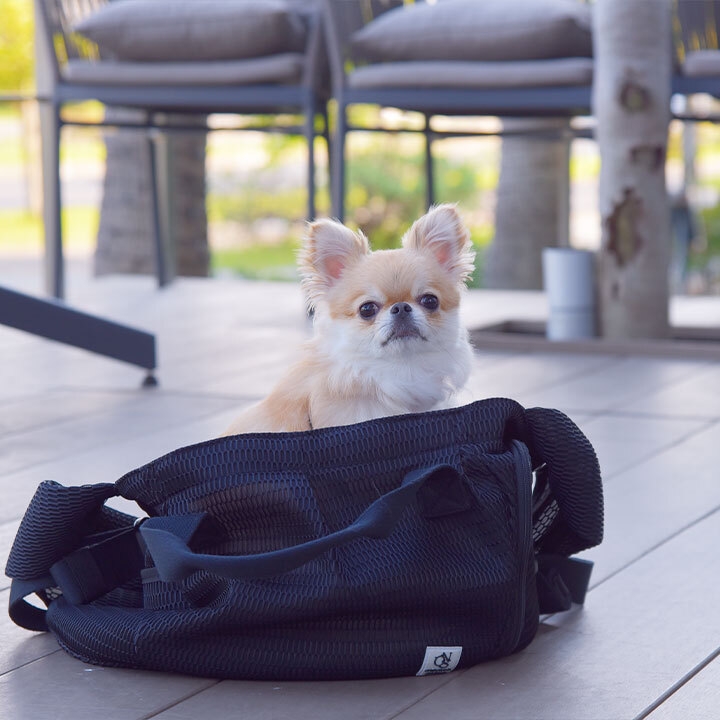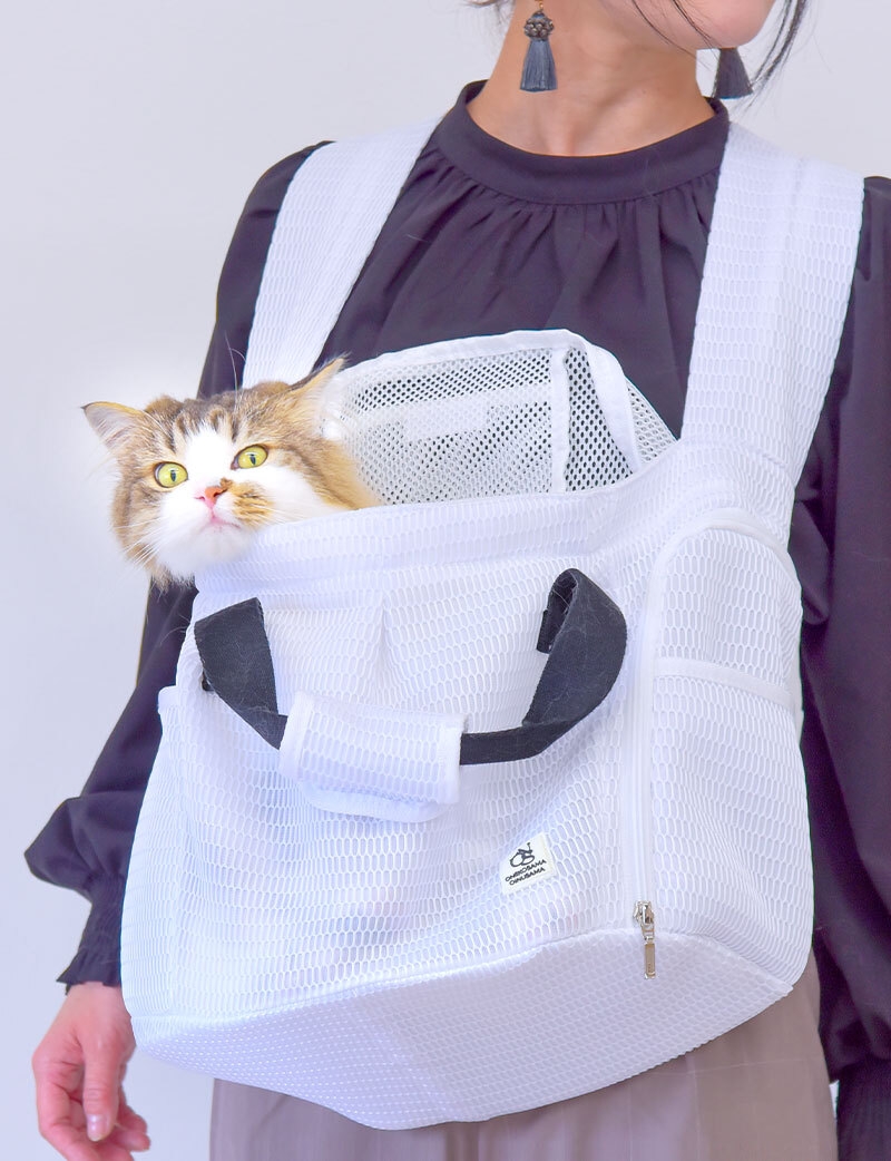 自社にて開発のベビー抱っこ紐のノウハウを生かし、ペット用品には珍しい前抱っこを実現いたしました。ペットスリングのように密着度が高く、ふたがメッシュで互いに様子が見られるので、避難中もペットの気持ちを落ち着け、安心感をもたらすことができます。