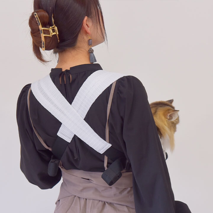 本体が約600g(Mサイズ)と、超軽量設計なので、同行避難で長時間の抱っこが求められる際にもペットオーナーへの負担が軽減されます。更に、前抱っこ時には背中部分でクロスをして両肩に重さが分散されるため、安定性が増してずり落ち防止にもなります。