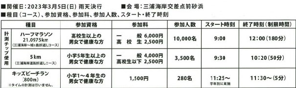 例年1万人を超えるランナーが参加する「第38回2023三浦国際市民マラソン」(三浦市、スポーツニッポン新聞社主催)が、来年3月5日(日)に開催されることが発表され、きょう11月1日からエントリーの受け付けが開始されました。種目はハーフマラソン・5㎞の部・キッズビーチラン(800m)です。