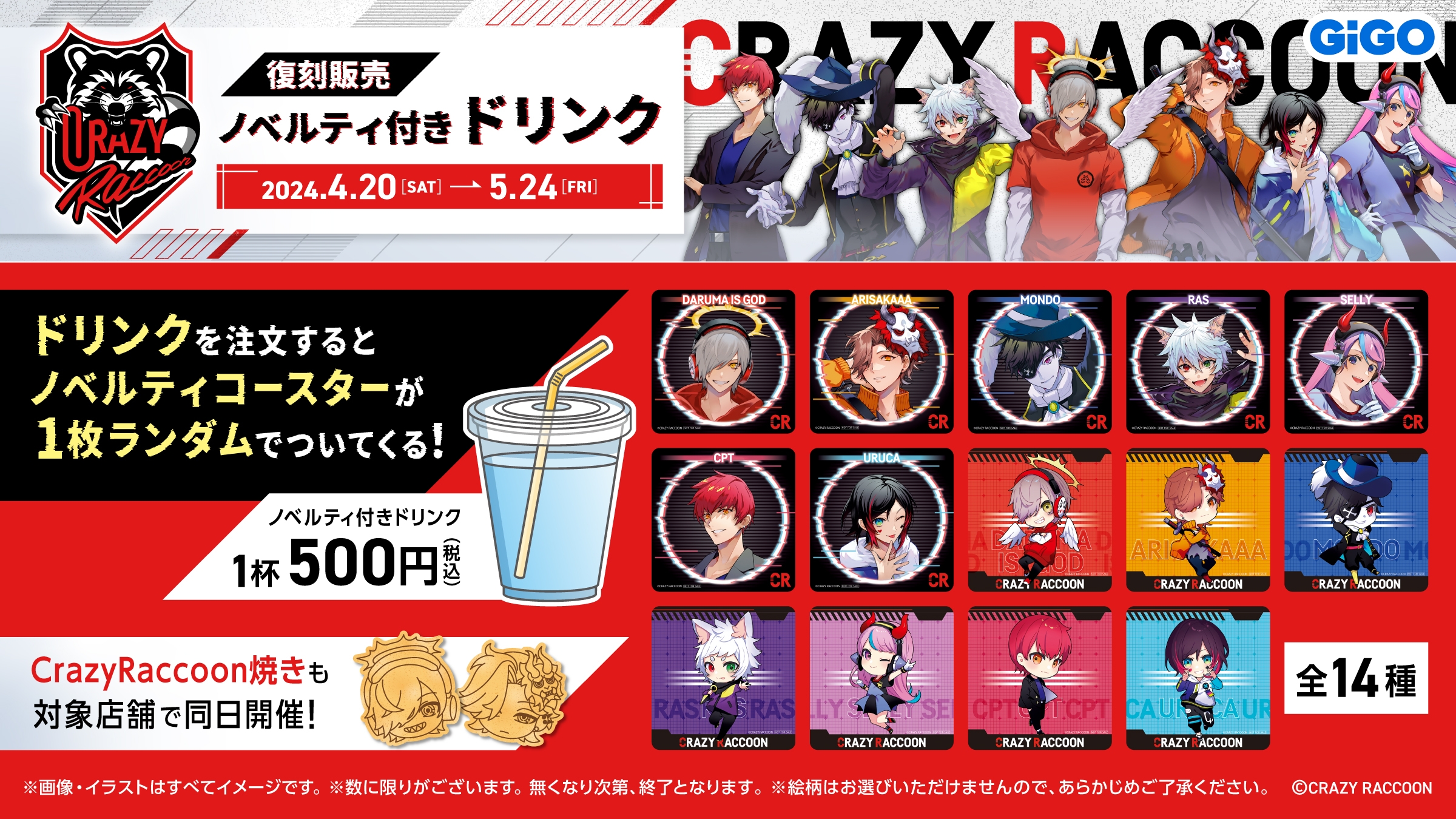 GiGOのたい焼きにてCrazy Raccoonのメンバーをモチーフにした『CRAZY RACCOON焼き』を販売いたします。『CRAZY RACCOON焼き』を1点ご購入につき、オリジナルコースター(全14種)をランダムで1枚進呈いたします。