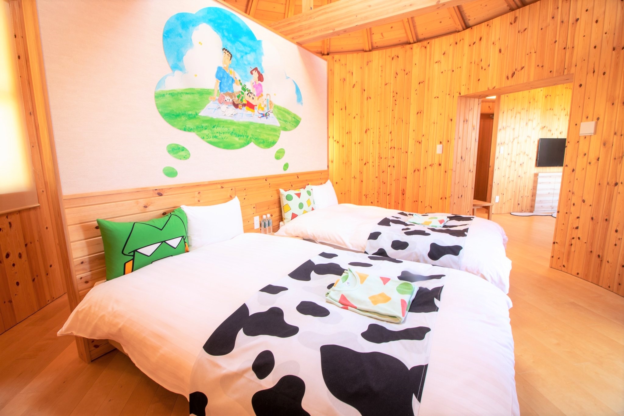 人気アニメ「クレヨンしんちゃん」に登場するキャラクターのデザインが部屋中に施されており、同作品の世界観を存分にお楽しみいただける一棟限定のヴィラ。登場キャラクターである“しんのすけ”や“ひまわり”が高さ5m の天窓からお部屋を覗く様子や、大きなシロのラグマットなど、遊び心があふれた仕掛けが盛りだくさんです。