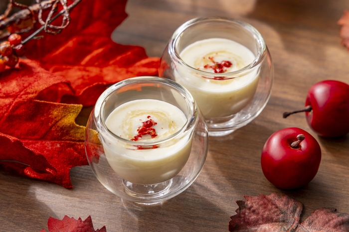 じゃがいもの冷製スープに秋の味覚である梨のピューレを合わせたさわやかな一品です。トップに添えた鮮やかなピンクペッパーが、彩りと香りのアクセントになっています。