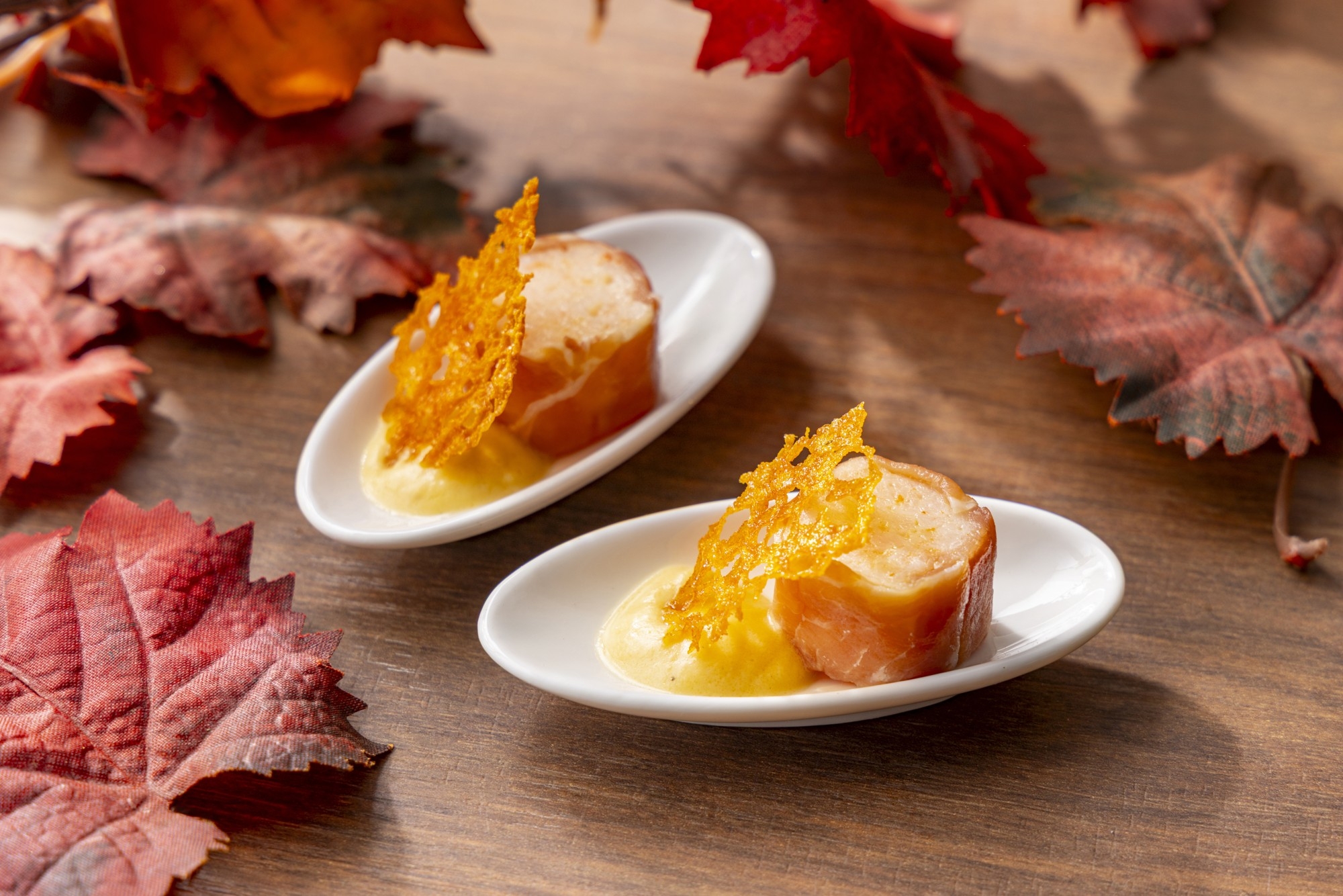 旬のかぼちゃをオーブンでじっくりローストし、はちみつと白醤油のキャラメルをまとわせました。みたらしのような優しい和風の味わいです。