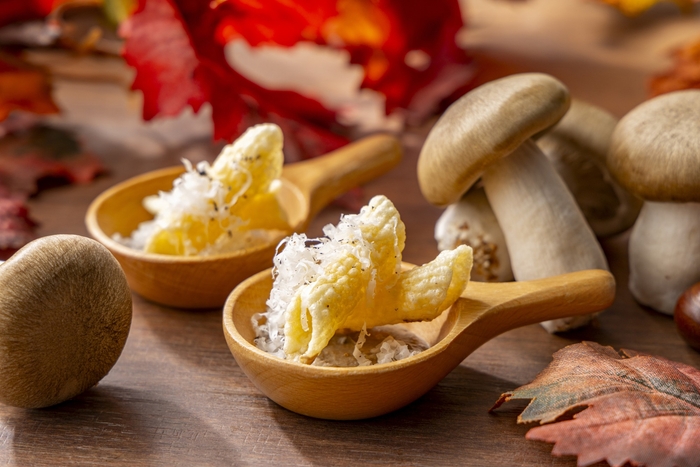 グルテンフリーの有機ペンネは、一度茹でてからフリットにすることでサクッとした食感に仕上げています。秋の味覚である濃厚なマッシュルームソースとともにお楽しみください。
