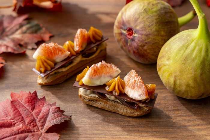 ココア生地のエクレアに、イチジク入りのカスタード、セミドライイチジクをのせ、板チョコレートで覆いました。トップにはキャラメルクリームとイチジクを飾っています。