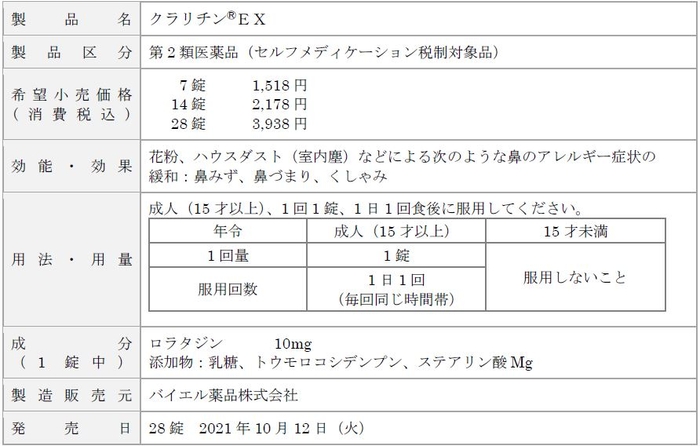 大正製薬株式会社[本社:東京都豊島区 社長:上原 茂](以下、当社)は、アレルギー専用鼻炎薬「クラリチンⓇEX」に28錠入りを細別追加することとし、10月12日より発売いたします。