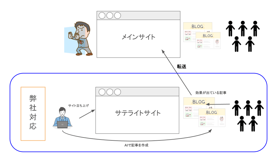ドラフトSEOは、お客様のサイトとは別に、お客様専用のサイトを独自のシステムで立ち上げ、お客様のサイトを守りつつ効果が出ている記事だけを納品するという仕組みです。