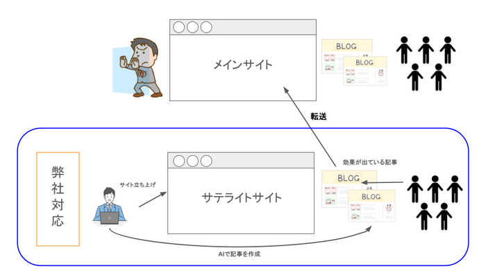 AIで作成した一定数成果が出ている記事をお客様のサイトへ転送。SEOの効果が引き継げる!