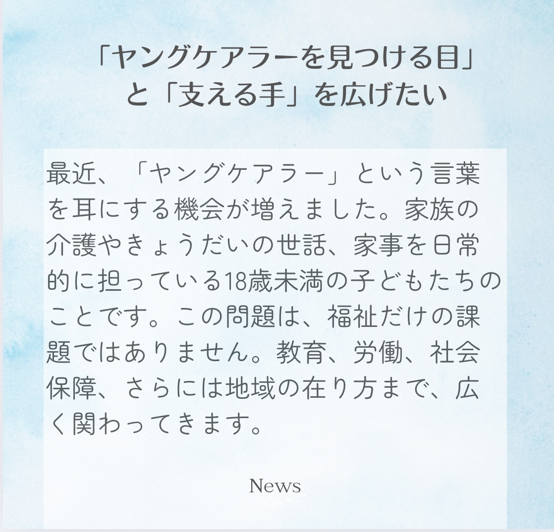 ヤングケアラーの問題は、単なる福祉課題ではなく、教育や労働、社会保障など多方面に関わるテーマです。