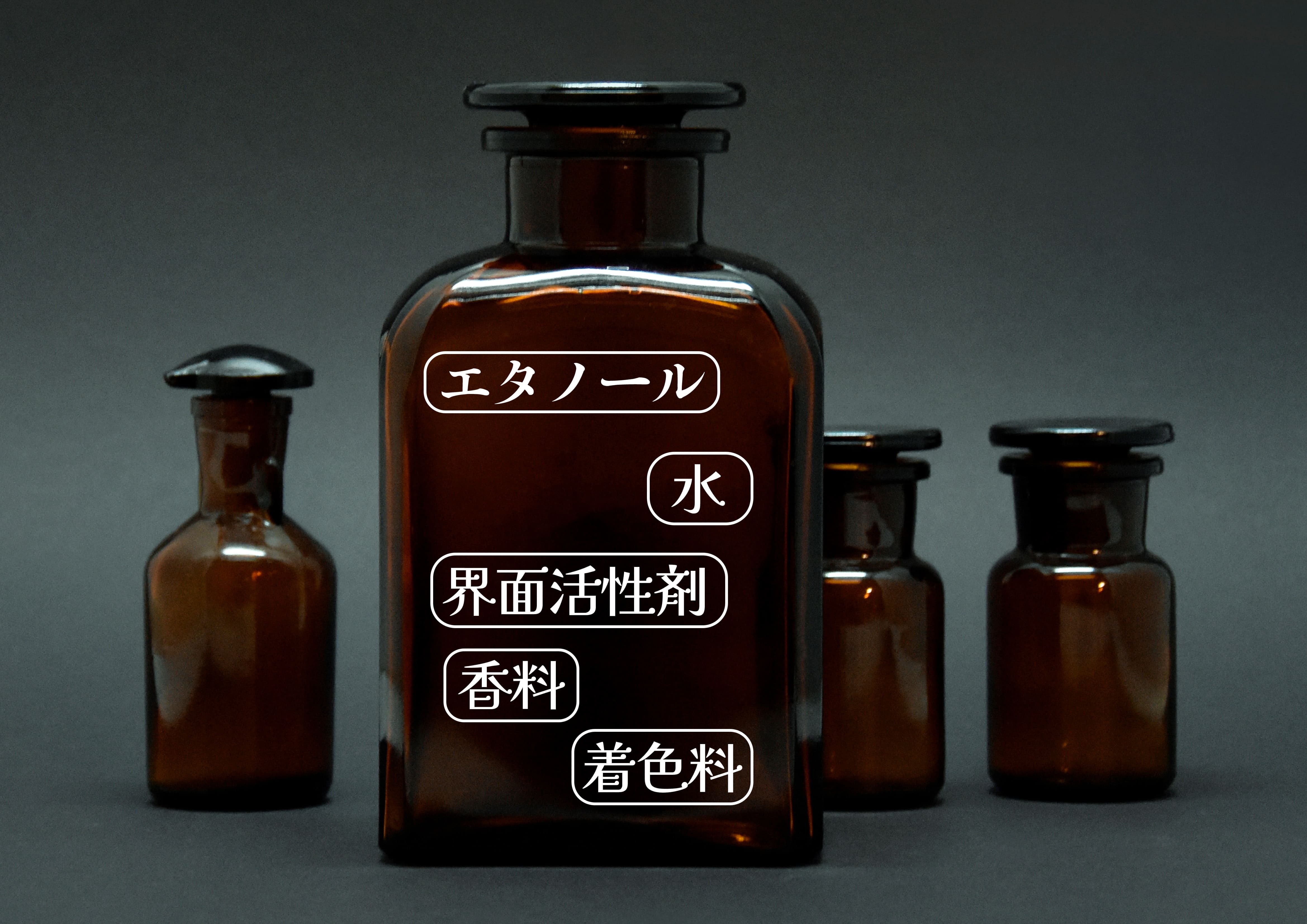 香水は香料とエタノールだけが入っているイメージの方が多いと思いますが、実は多くの成分(水、界面活性剤、色素など)が混ざっている可能性があります。