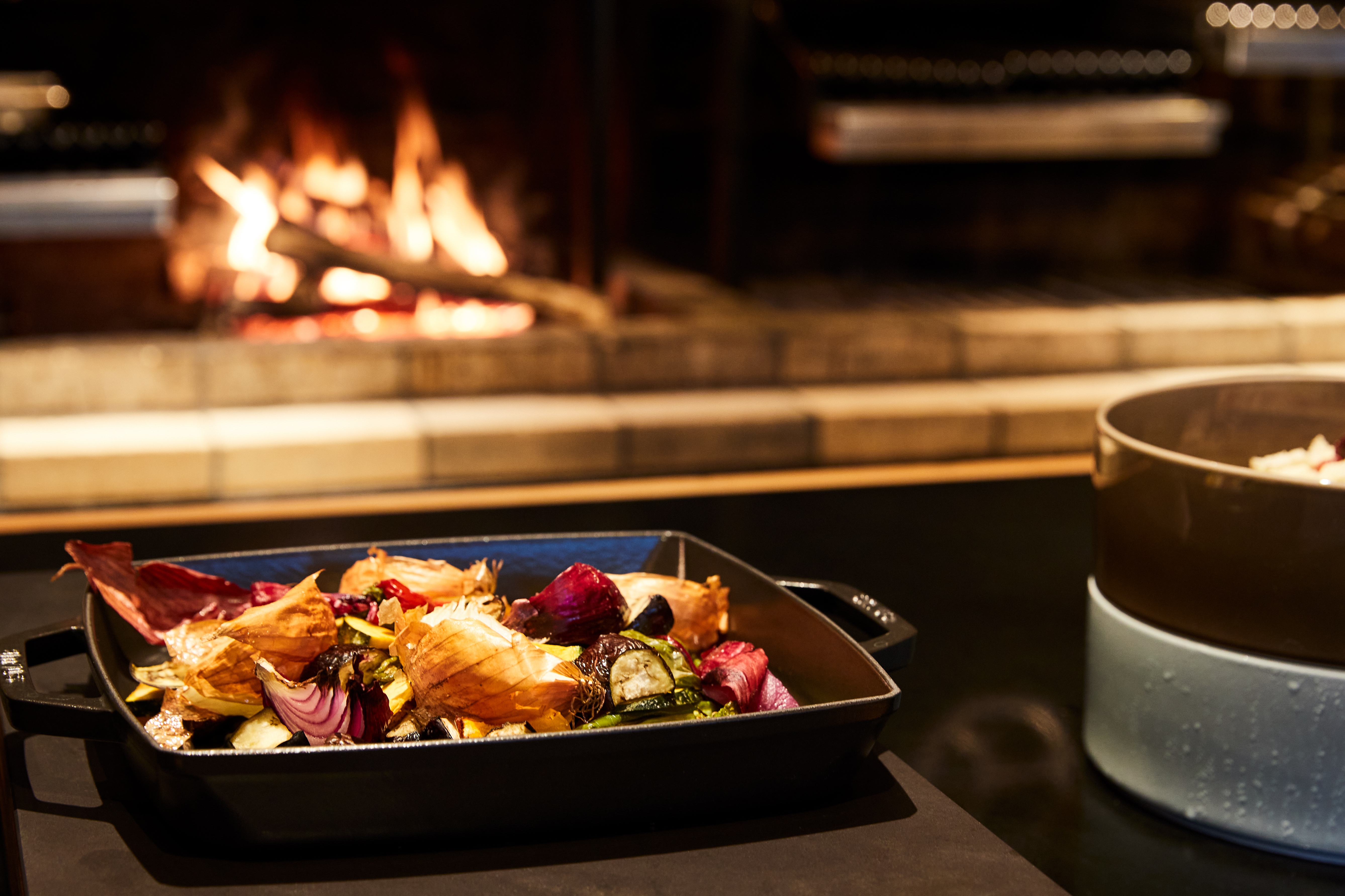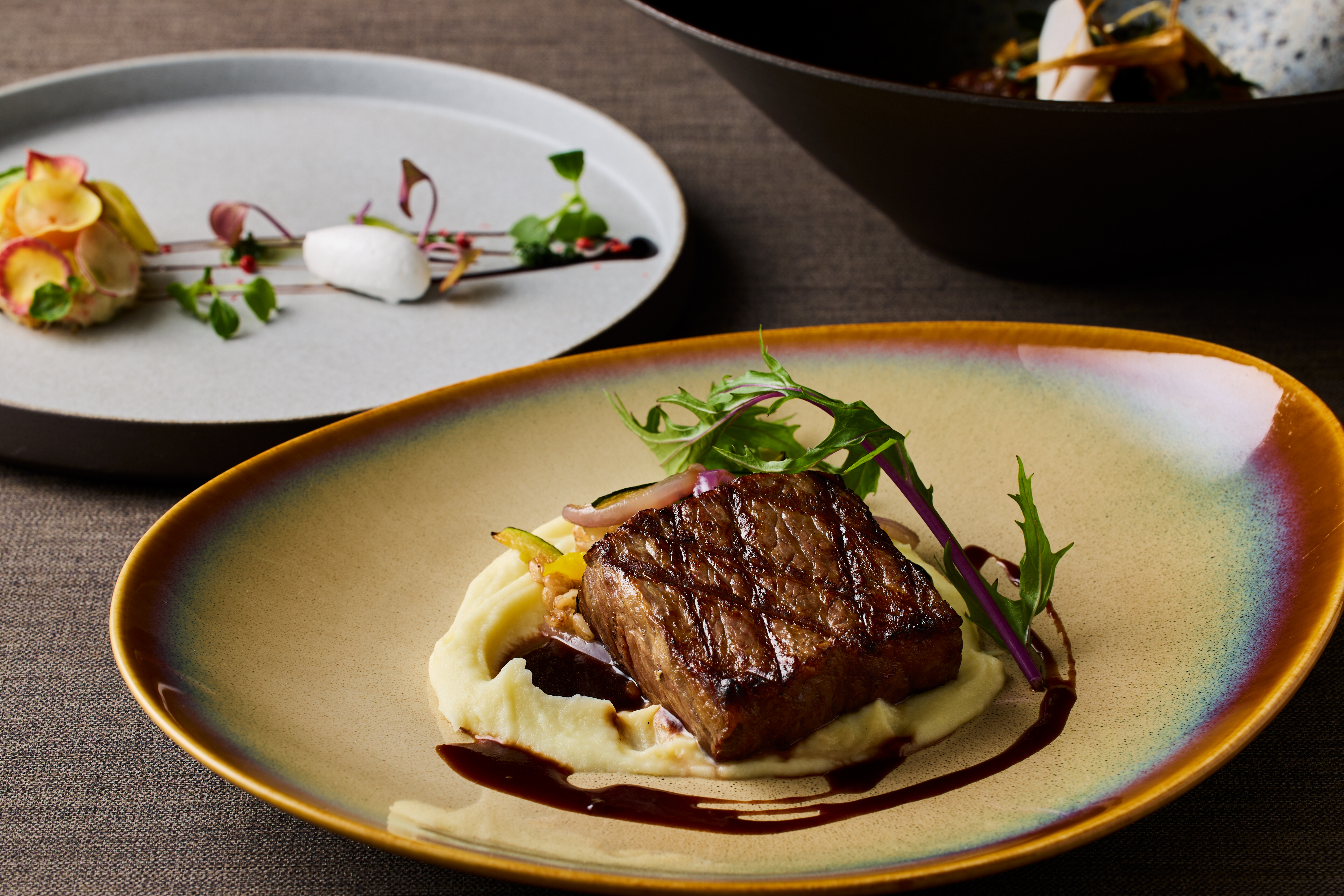 レストラン「リバーサイドキッチン&バー」では、シェフがダイニングの中央で巧みに炎を舞わせ、豪快なグリル料理の数々を提供します。その薪火料理には間伐材のヒノキや楢の木を使用し、そこから放たれる燻煙が肉に深い風味を添えます。この特別な調理法により、肉のうまみが最大限に引き出され、贅沢な一皿が生まれます。