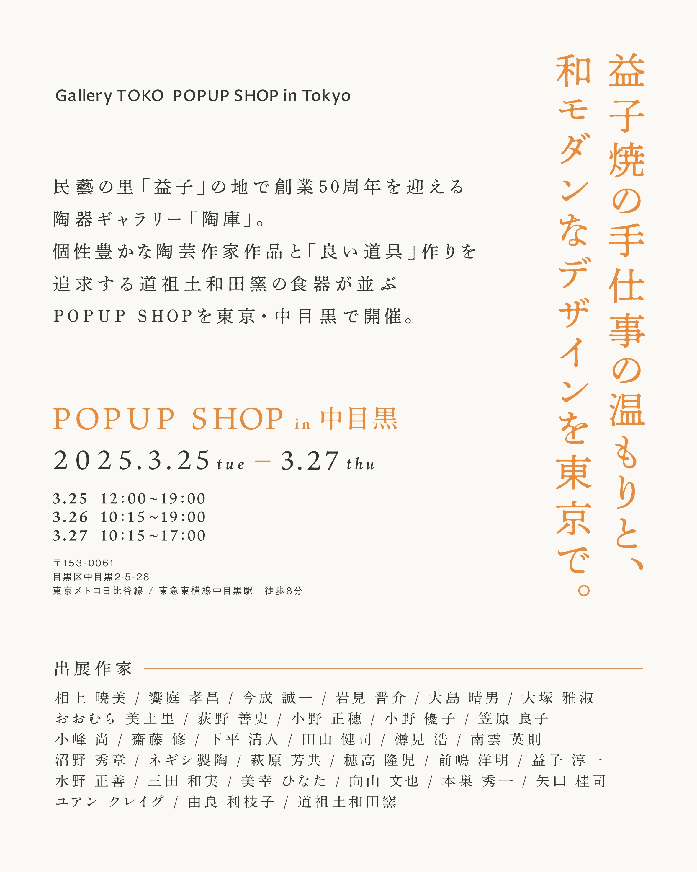 陶器ギャラリー「陶庫」(有限会社 陶庫、所在地:栃木県益子町)は、創業50周年を記念し、2025年3月25日(火)~3月27日(木)の3日間、桜が咲き誇る目黒川沿いの会場にてPOPUP SHOPを開催いたします。