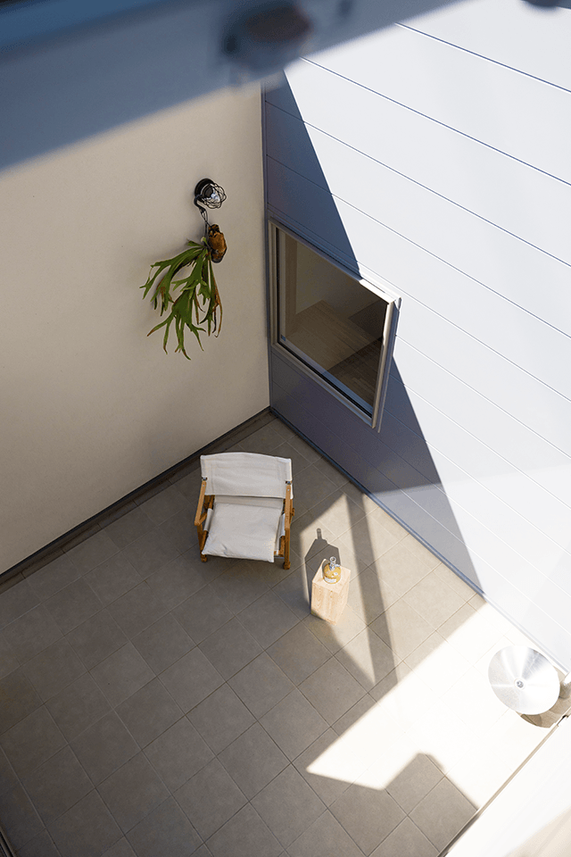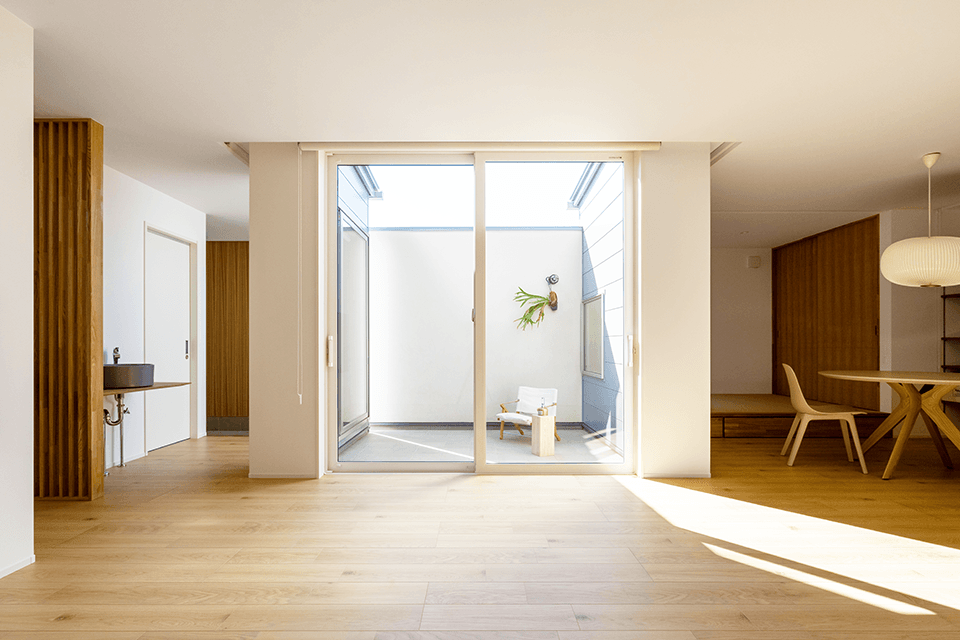 この住まいのもう一つの特長は、屋内と連続する“アウトドアリビング”です。リビングからそのまま続くタイルデッキの外空間は、周囲からの視線を遮ったプライベートな庭。猫が自由に歩き回れるよう、段差もなく安全設計されており、昼は日向ぼっこ、夜はそよ風を感じながら家族とともに過ごせる場所です。