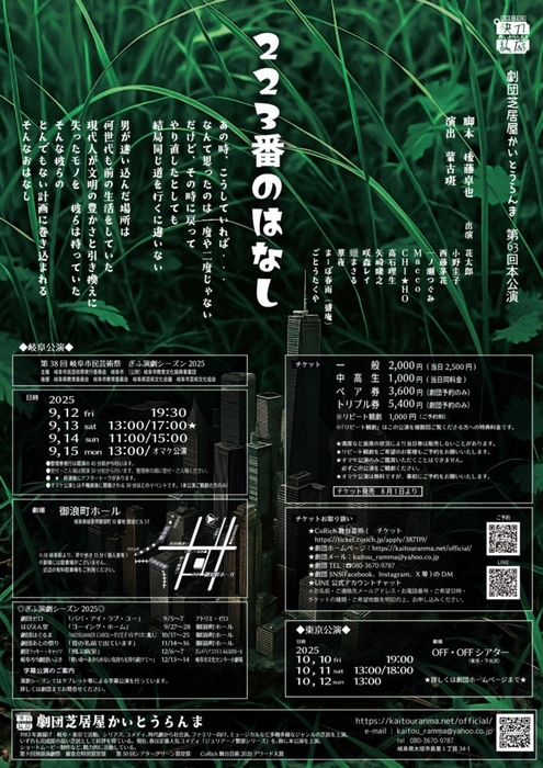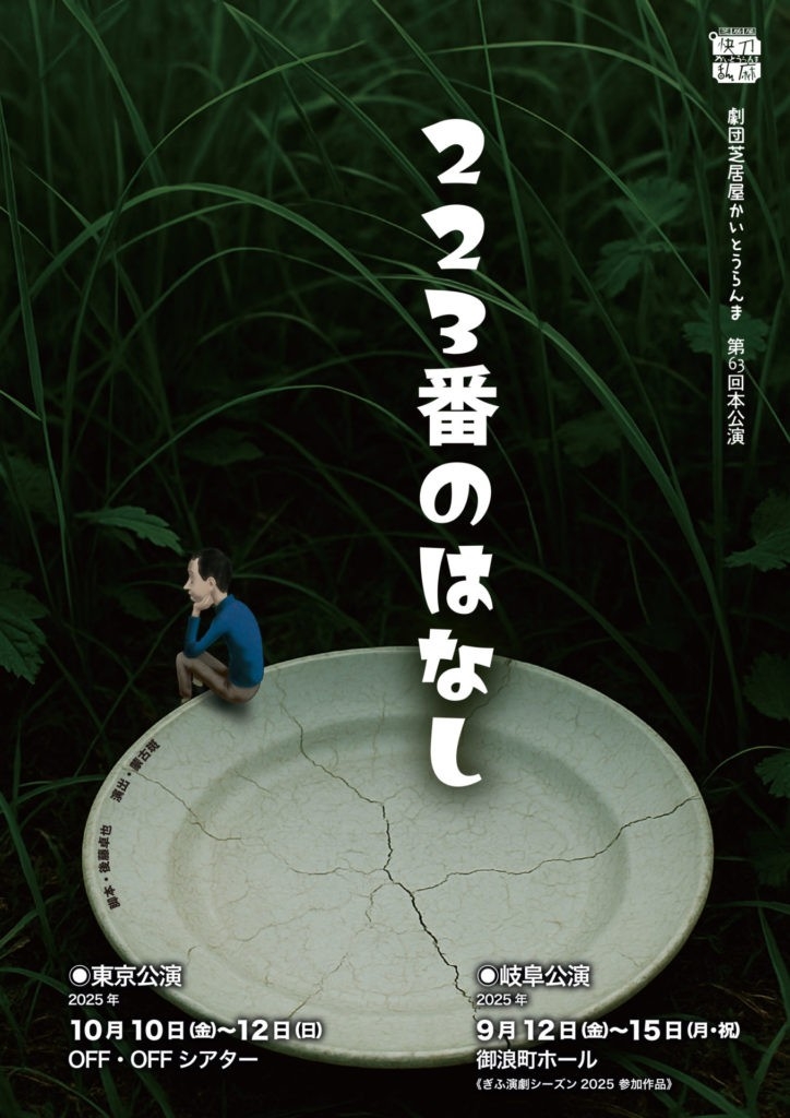 劇団芝居屋かいとうらんま主催、第63回本公演『223番のはなし』が2025年10月10日 (金) 〜 2025年10月12日 (日)に下北沢 OFF・OFFシアター(東京都 世田谷区 北沢 2-11-8 TAROビル3F)にて上演されます。 チケットはカンフェティ(運営:ロングランプランニング株式会社、東京都新宿区、代表取締役:榑松 大剛)にて2025年8月23日(土) 00:00~予約受付開始です。