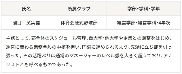 大学スポーツを支援することで、大学スポーツの振興に寄与した個人を表彰する。