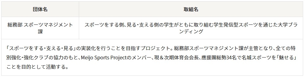 大学スポーツの普及や活性化、大会等における集客・応援促進のための先進的な取組を表彰する。