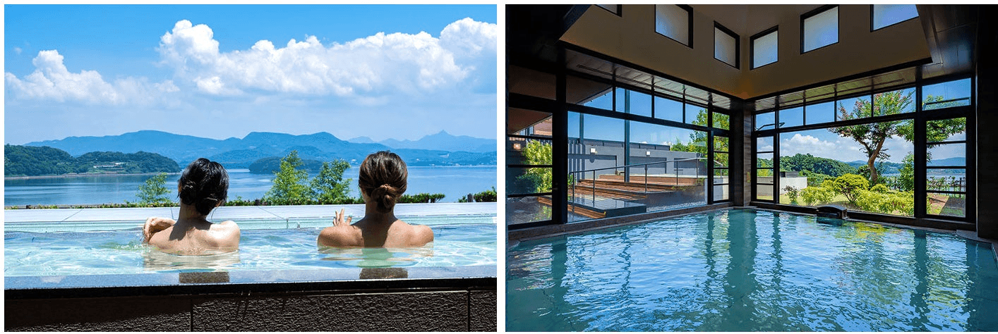 のんびりと穏やかな表情を見せる大村湾を望む露天風呂。