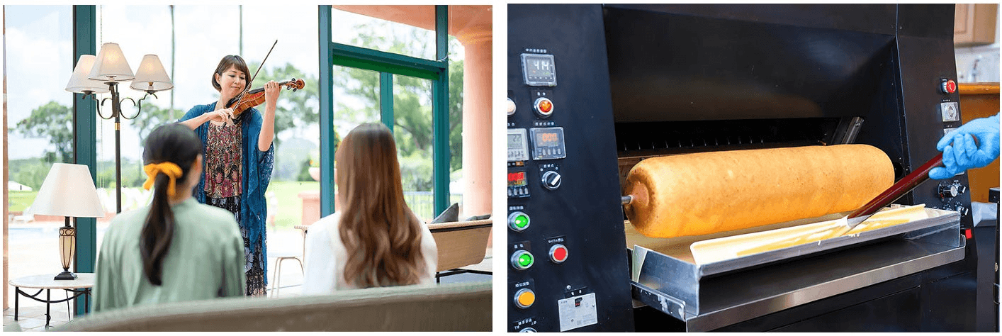 左:バイオリンやピアノなど、生演奏ならではの調べが非日常のひと時に誘います。