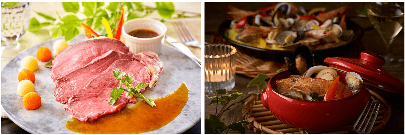 左:調理長自慢のスペシャリテ。低温でじっくり火を通した、しっとりした赤身の美味しさを味わうローストビーフ。